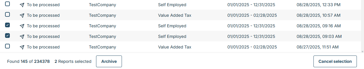 Bottom of the Reports window, can be found Archive option. You can select one or multible reports to be archived. Archiving the report, you can filter it out of the list without cancelling the report. If needed, you can also Unarchive the report and continue the process for the report.