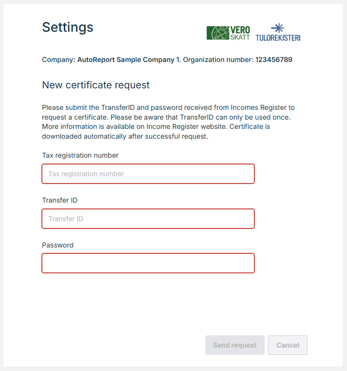 Insert here the transferId and password received from Incomes Register to request a certificate. Please be aware that transferId can be used only once. If you need same certificate for all your companies, you can click the “Activate for all companies” after credentials are saved.