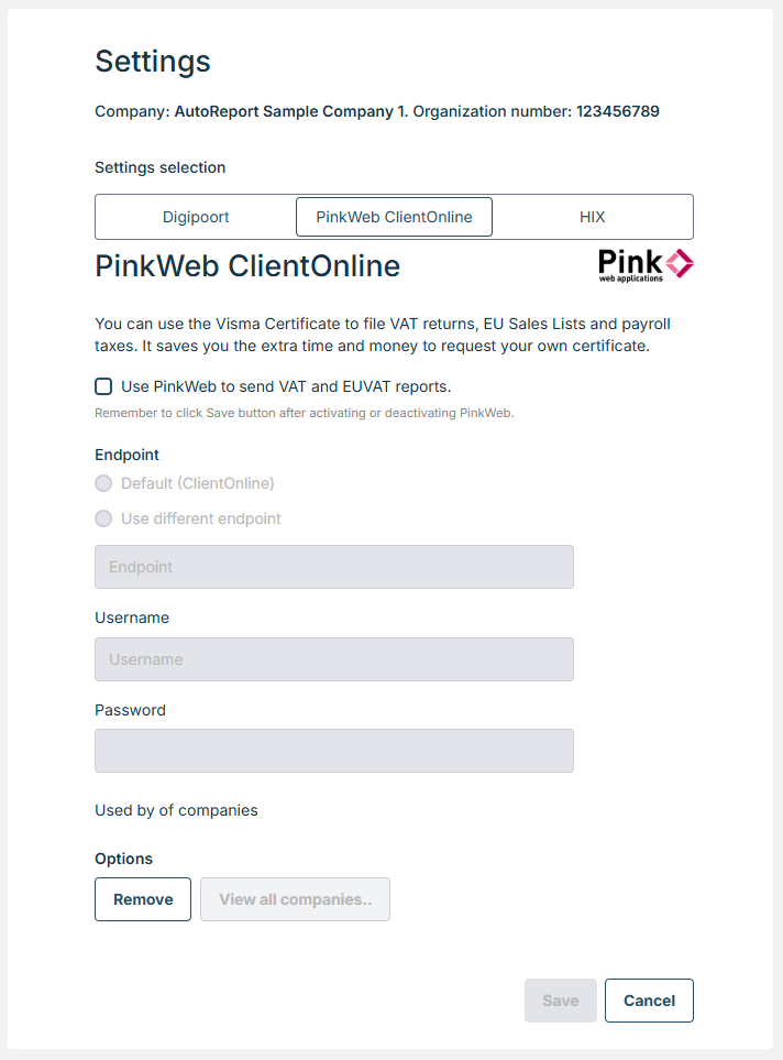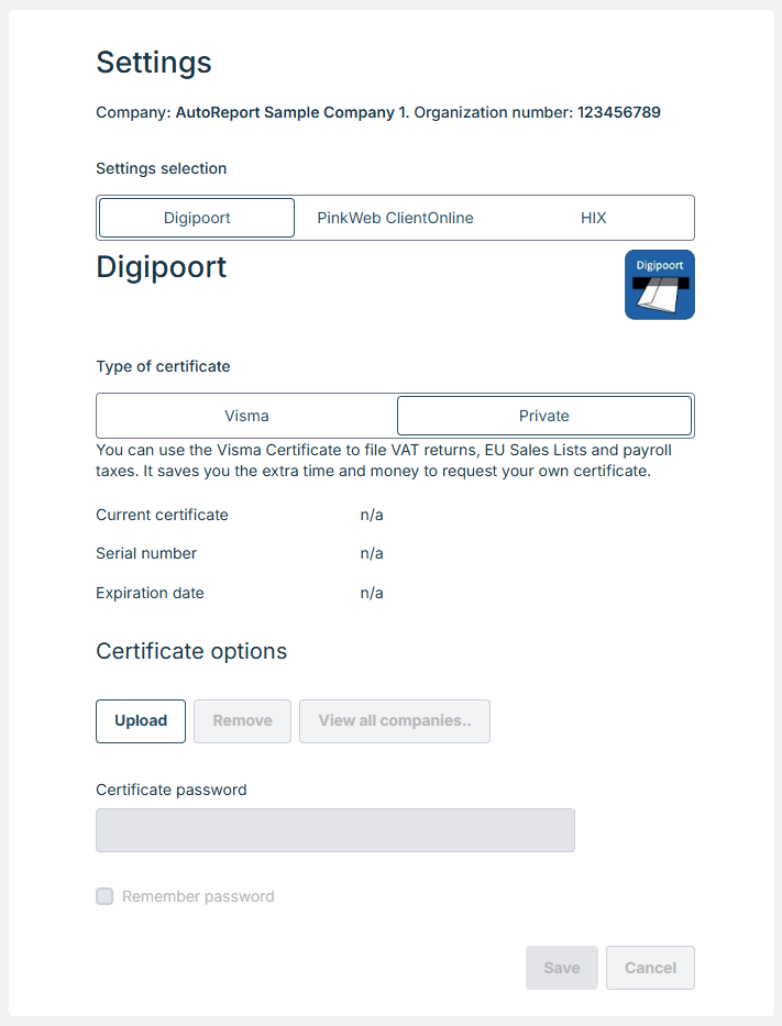 After you have saved the certificate, ‘View all companies’ button will appear. In the ‘View all companies’, it is possible to save current company’s credentials to other companies the user has access to.
