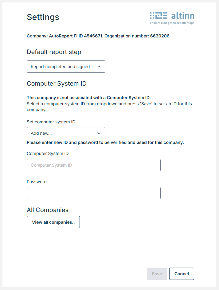 In this window you can save or change Computer System ID and Computer System Password used for authentication to Altinn. These settings can be used for sending reports like VAT before 2022, E-tax card request, a-message, etc.