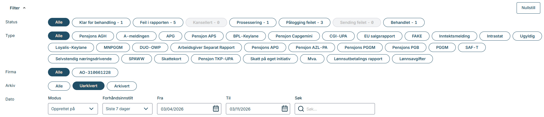 Denne informasjonen er knyttet til hvilken type rapport som er sendt. Avhengig av hva som er sendt, kan typen være MVA-melding, EU-salg uten moms, lønnsinformasjon, A-melding, Intrastat osv.. Du kan velge én eller flere typer.