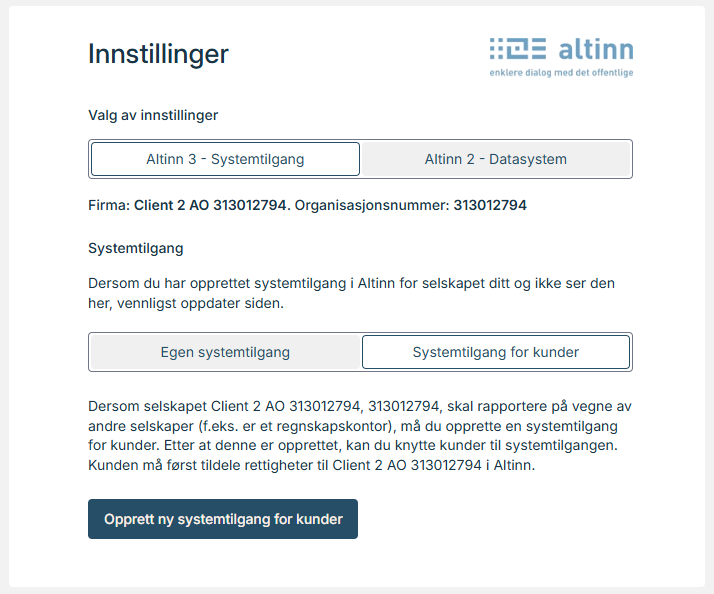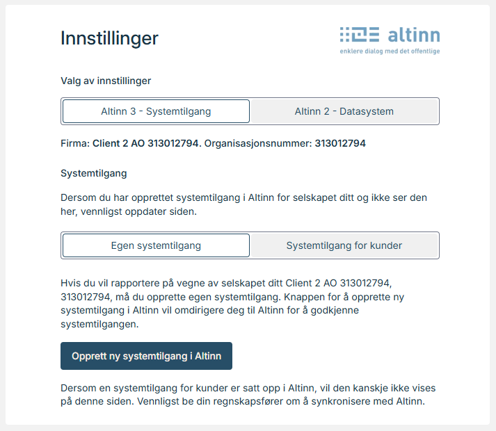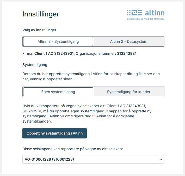 Med systemtilgang for klientforhold (se nedenfor) er det mulig å rapportere på vegne av andre virksomheter. Hvis f.eks. et regnskapsbyrå rapporterer på vegne av den innloggede virksomheten, vil dette vises i innstillingene for den innloggede virksomheten: