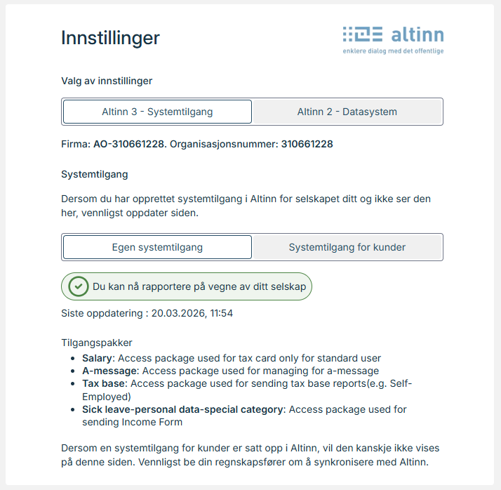 Her kan du administrere koblingen mellom AutoReport og Altinn 3. En systemtilgang må opprettes for å kunne sende rapporter til Altinn 3. Når systemtilgangen er opprettet, kreves ingen personlig innlogging ved innsending av rapporter.