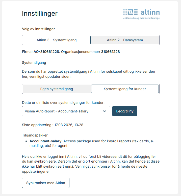- Trykk på “Synkroniser med Altinn” og logg inn i Altinn.