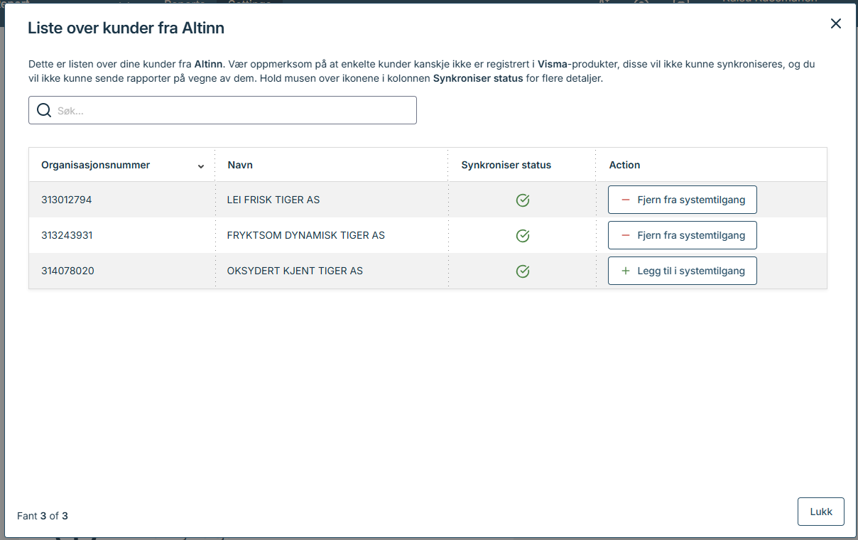 Dersom kunden ikke vises i listen, er det mulig at klientforholdet ikke er satt opp i Altinn. Hvordan dette settes opp i Altinn er beskrevet her.