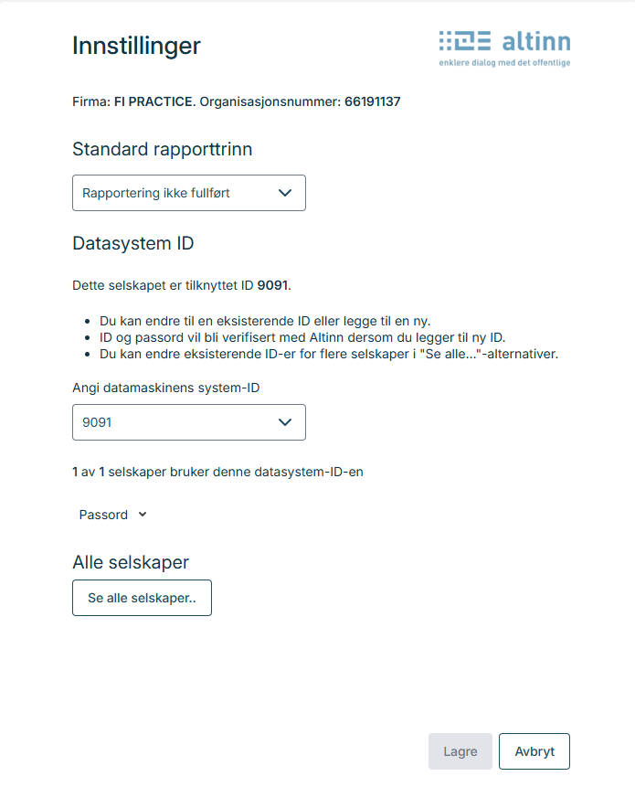I dette vinduet kan du lagre eller endre Datasystem ID og Passord som brukes til autentisering mot Altinn. Disse innstillingene brukes for sending av rapporter som forespørsel om elektronisk skattekort, a-melding, osv.