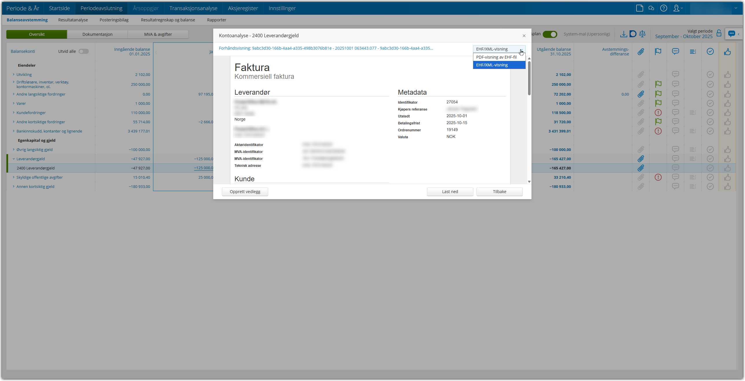 Når du importerer transaksjoner som inkluderer EHF-fakturaer, kan du nå klikke for å se en detaljert forhåndsvisning av EHF-dataene.