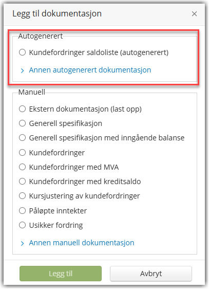 Det finnes nå en ny type avstemmingsdokumentasjon som automatisk henter og preutfyller data fra valgt importkilde. Når du oppretter et dokument, finner du de nye malene under Autogenerert.